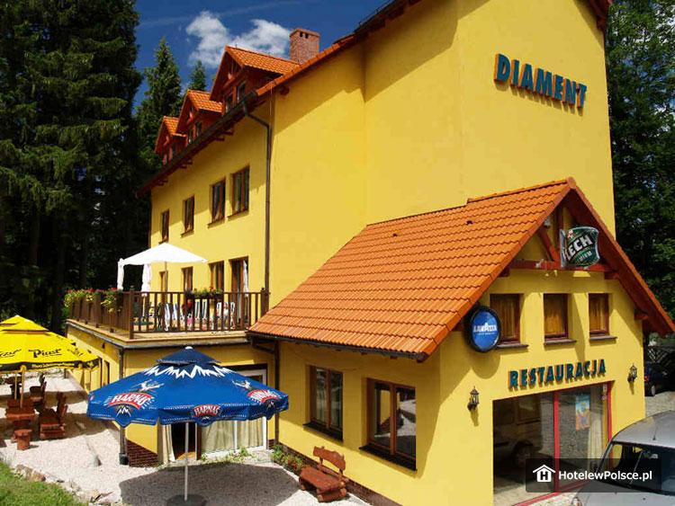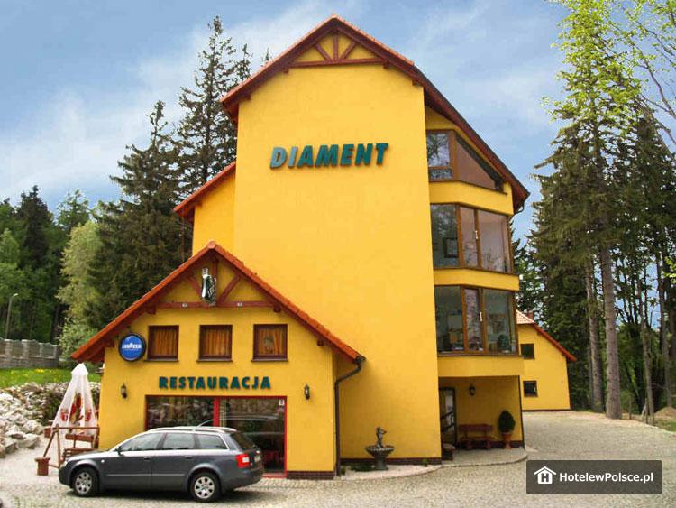 Hotel DIAMENT to nowy ośrodek o wysokim standardzie, oddający do dyspozycji 15 pokoi 2 i 3 osobowych, wyposażonych w pełny węzeł sanitarny, TV-Sat, telefon, sejf oraz radio. Do dyspozycji Gości oddajemy również 6-8 osobowy Domek znajdujący się w sąsiedztwie hotelu, w skład którego wchodzą: pokój dzienny z kominkiem, aneks kuchenny, dwie sypialnie z łożami, sypialnie z łóżkami osobnymi oraz 2 łazienki z pełnym węzłem sanitarnym.