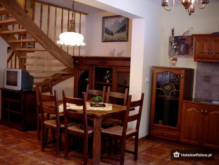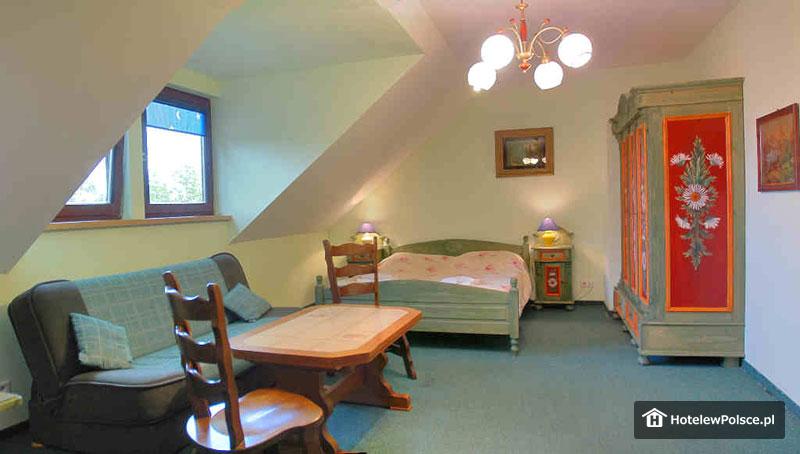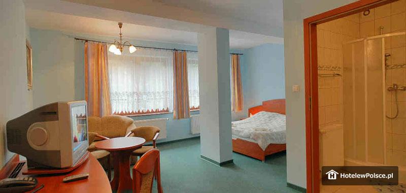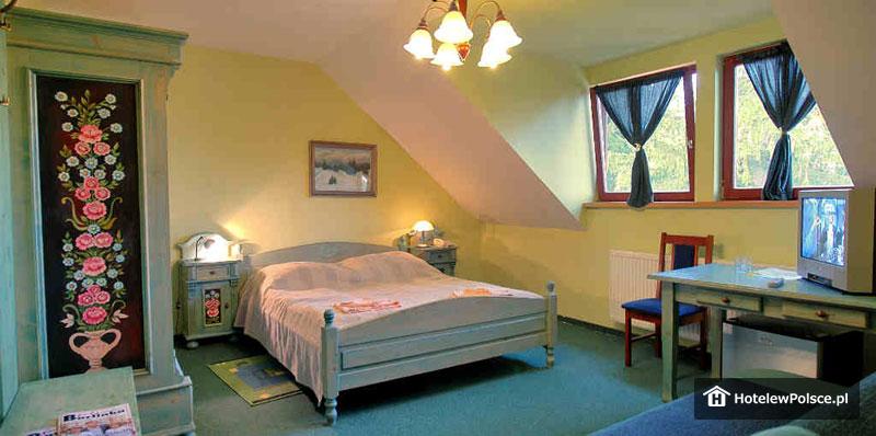 Do dyspozycji 15 pokoi 2 i 3 osobowych, wyposażonych w pełny węzeł sanitarny, TV-Sat, telefon, sejf oraz radio. Do dyspozycji Gości oddajemy również 6-8 osobowy Domek znajdujący się w sąsiedztwie hotelu, w skład którego wchodzą: pokój dzienny z kominkiem, aneks kuchenny, dwie sypialnie z łożami, sypialnie z łóżkami osobnymi oraz 2 łazienki z pełnym węzłem sanitarnym.